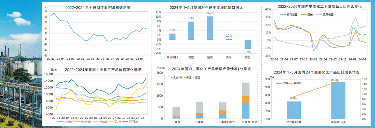 與此同時,全球制造業回暖,在海外補庫存需求的提振下,產品出口增長逐步恢復。6月,全球制造業PMI為50.9%,連續5個月位于擴張區間,美國多數行業進入補庫存階段,全球貿易景氣度明顯改善。今年1~5月,我國出口總值(以美元計)同比增長2.7%,增速較去年同期提升4.1個百分點,其中,對東盟、拉美等新興經濟體的出口量高于對美國、歐盟等發達經濟體的出口量,與化工產品相關的塑料制品、服裝、家用電器等產品出口觸底回升,24個主要化工產品累計出口932.8萬噸,同比增長15.1%。